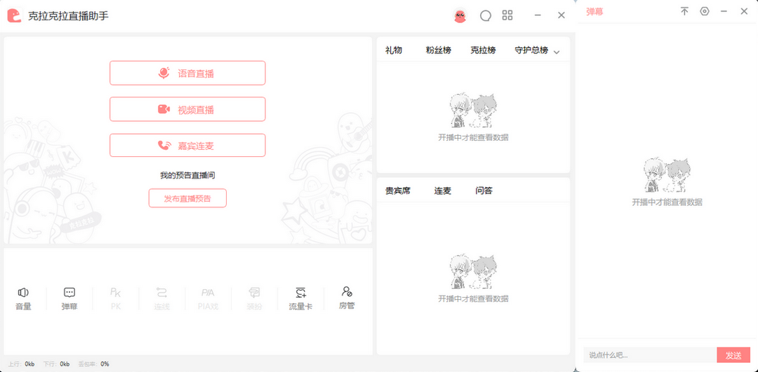 克拉克拉直播助手是一款功能强大的直播辅助软件,软件操作简单易用,提供有趣的玩法,比如连麦玩法,多人语音连线,打破空间限制,支持礼物、粉丝榜、克拉榜、守护总榜、贵宾席、连麦、问答等信息,让直播内容更精彩,满足用户的多样化社交需求,对电脑版感兴趣的小伙伴不妨下载体验一下吧!