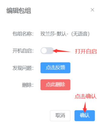 3、打开编辑包组,选择【开机自启】并点【确定】即可。