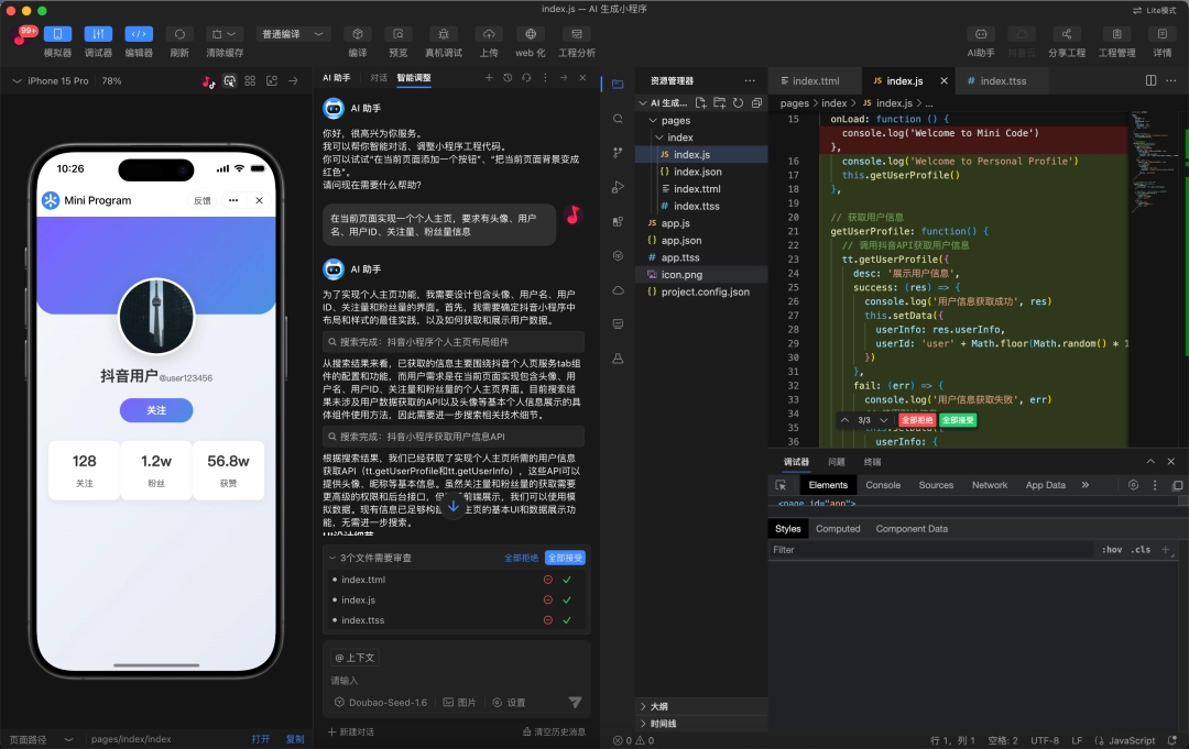 •新增:小程序支持 AI 助手智能调整模式,可以使用自然语言 / 设计图快速生成和调整应用,查看详情