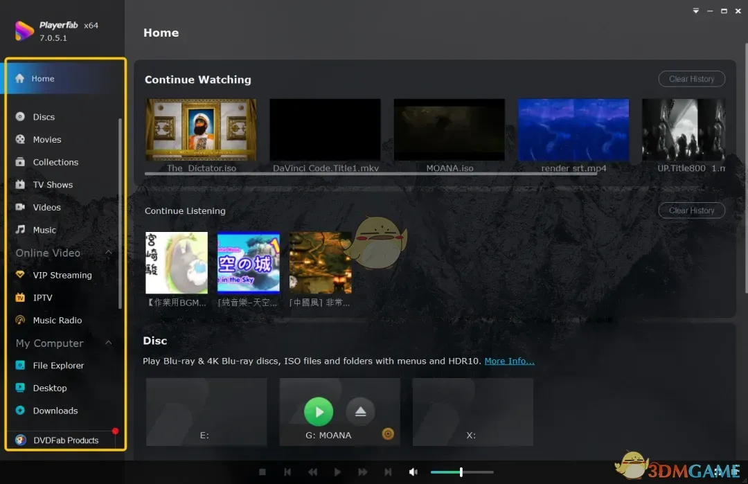 PlayerFab是一款非常专业的视频和音乐播放器,软件功能强大,使用起来十分便捷,支持所有常见的视频格式,包括HEVC(H.265)、UHD(超高清)和4K视频,以及DVD/Blu-ray ISO格式的文件和文件夹,能够帮助用户进行本地视频的播放,满足用户们对蓝光、DVD以及媒体视频播放的使用需求,大大的提升了使用体验,感兴趣的小伙伴赶快下载使用吧!
