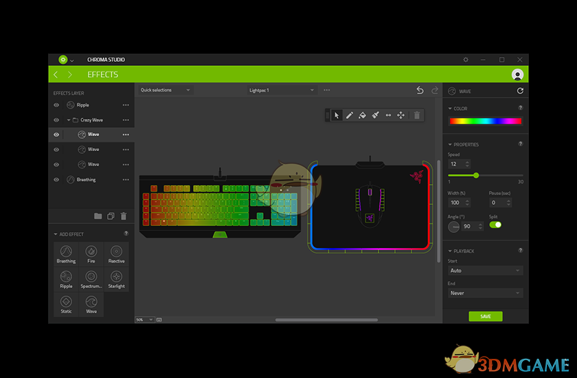 Razer Synapse 雷云 3 配备了全新的 Chroma Studio — 先进的灯光效果配置工具,让你可以创建多种灯光效果并同步到多款设备上。