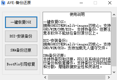 AYE备份还原是一款专门用来备份和恢复数据的软件,如果用户想要进行重装系统等操作不妨使用该软件先把数据备份下来。软件提供多种备份工具,而且还提供引导修复工具,修复问题,是一款很不错的软件,我们在日常生活中也经常能够使用到,对该软件感兴趣的小伙伴千万别错过,快来下载吧!