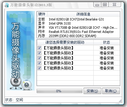 2、点击“安装”,进度条完成后重启电脑,再插入摄像头即可调用。