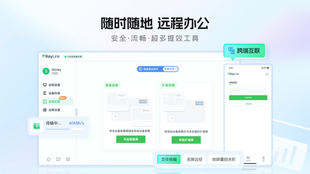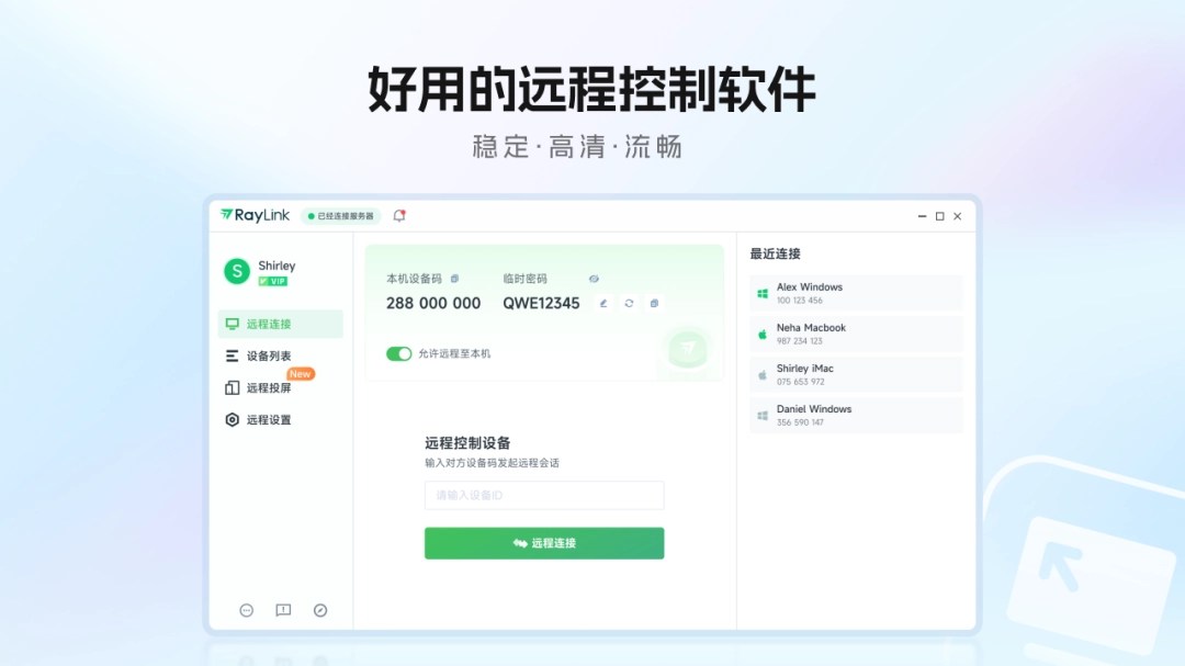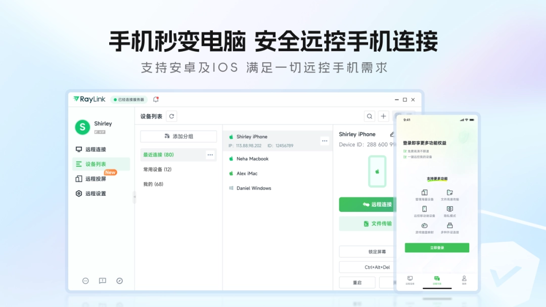 RayLink是一款非常实用的远程控制软件,软件功能强大,操作简单易用,支持Win11、Win10、Win8、Win7(64位)等操作系统,提供了在线协作办公、屏幕共享、远程会议等丰富的功能,轻松满足远程办公、远程协助、远程运维等各类场景的需求,有需要的小伙伴赶紧下载体验试试吧!