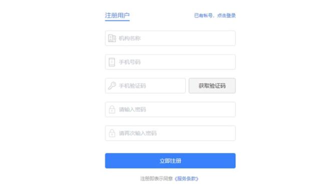 3、填写自己的机构名称手机号码等信息后点击【立即注册】即可。