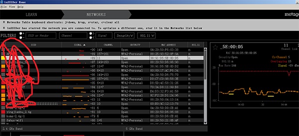通过inSSIDer搜索无线热点,我们可以看到每个热点的MAC地址、网络名称(SSID)、无线信号强度、使用的信道、加密方式、无线传输速率和网络类型等主要信息,非常的全面。此外,在这些基本信息的下方,我们还可以查看每个时间段每个无线热点的信号强度和稳定性(纵坐标:信号强度,横坐标:时间段),其中纵坐标越高,表明信号强度越强,而横坐标越平滑,则表明无线信号越稳定。