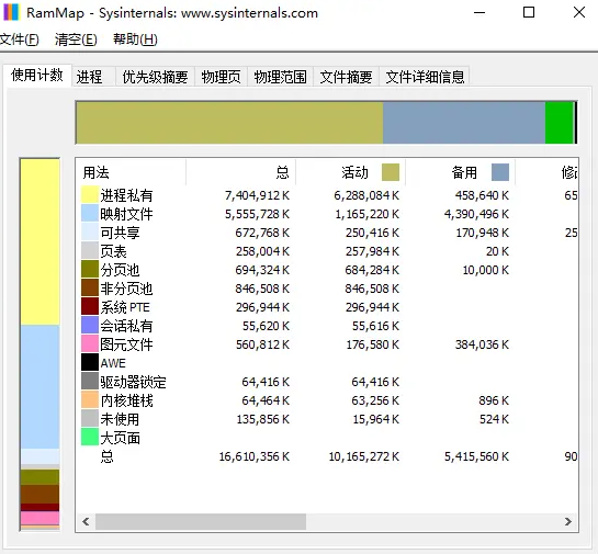 RAMMap是一款内存管理分析工具,可以分析和清理Windows系统的物理内存使用情况以及不同的内存区域。你可以根据内存使用类型分类显示文件。同时,该工具还具有一键清除区域数据的功能,你可以在清除菜单中一键快速清除指定区域的数据信息,是一款不错的软件,对该软件网页版感兴趣的用户快来下载!