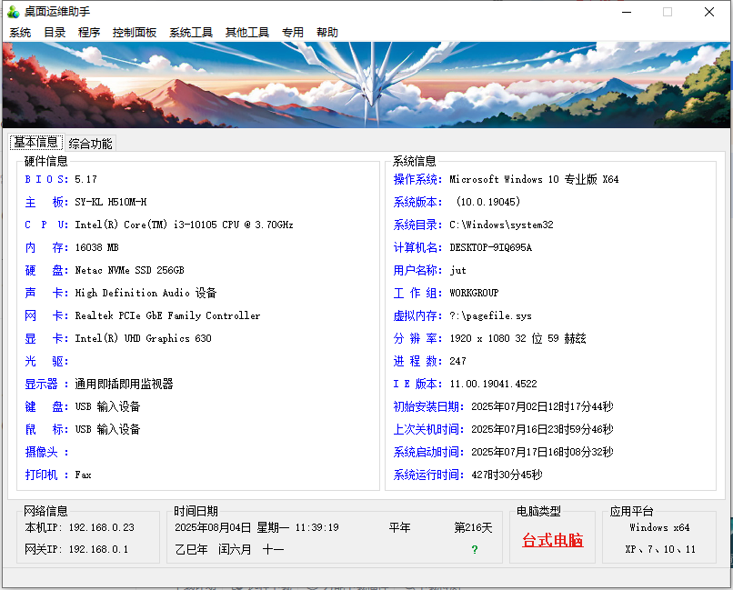 下载桌面运维助手是一个功能强大的Windows系统运维工具,打开软件就能实时显示电脑硬件信息,以及操作系统版本和网络状态,为用户了解电脑配置和排查硬件相关问题提供便利,大家可以用它来解决各种电脑异常问题,是一款不错的软件,我们在日常生活中也能使用到,对该软件电脑版感兴趣的可以下载使用!