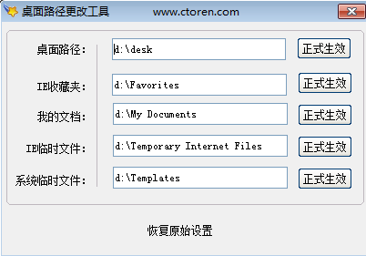 下载桌面路径更改工具是一款系统文件夹路径更改工具 路径, 系统, 工具, 文件可以更改包括:桌面、IE收藏夹、我的文档、IE临时目录、系统文件临时文件等默认路径,简单的界面,直观清晰的布局,操作简单,容易上手,是不可多得的利器,对该软件电脑版有需求的小伙伴千万别错过,快来下载吧!