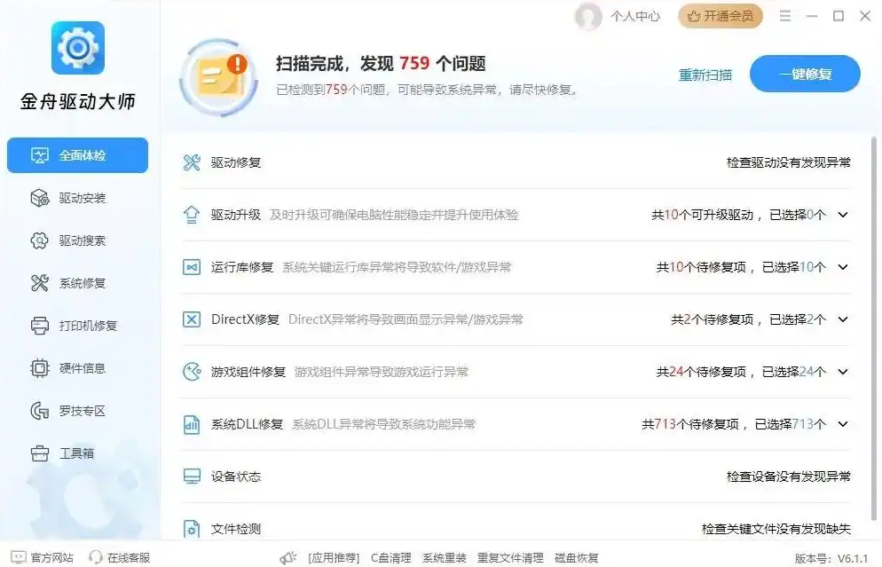 2、该软件还提供系统组件异常诊断与修复功能,可解决DirectX运行库缺失、DLL文件错误等问题,并能专项修复打印机驱动故障,保障硬件设备稳定运行。