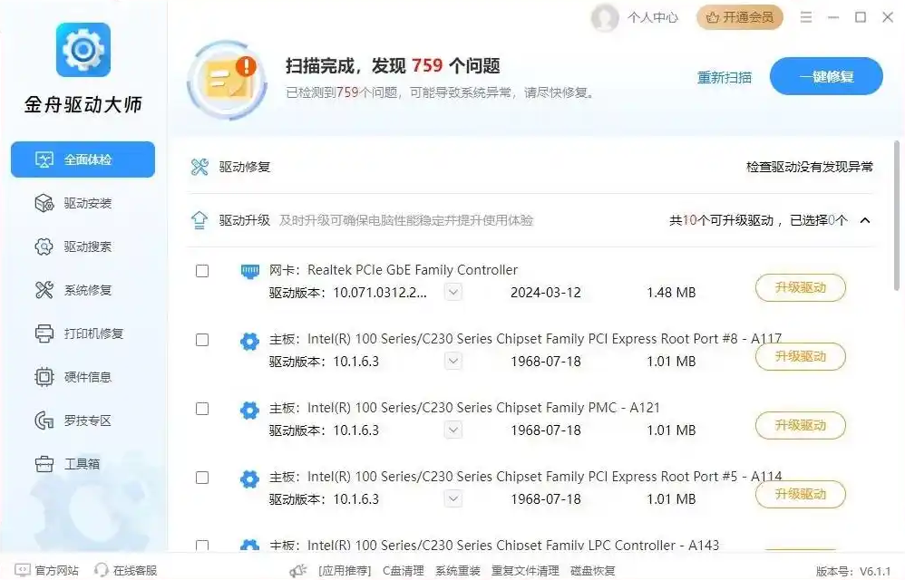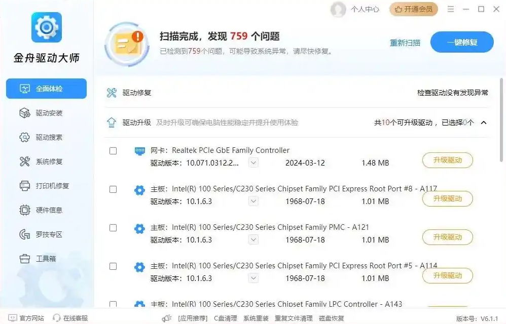 金舟驱动大师是一款驱动管理工具软件,它提供硬件驱动修复、系统组件异常诊断及电脑问题综合解决方案,支持Windows多版本操作系统,通过智能匹配百万级驱动库实现显卡、声卡、网卡等硬件的精准驱动更新,是一款很不错的软件,我们在日常中经常能用到,感兴趣的话快来下载吧。