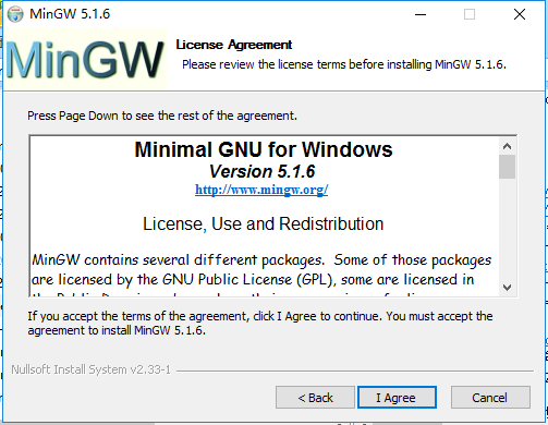3、进入MinGW安装协议界面,点击【I Agree】。