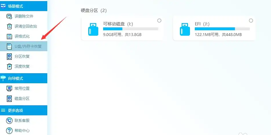 1、打开软件,插上需要恢复的u盘设备,选择u盘恢复。