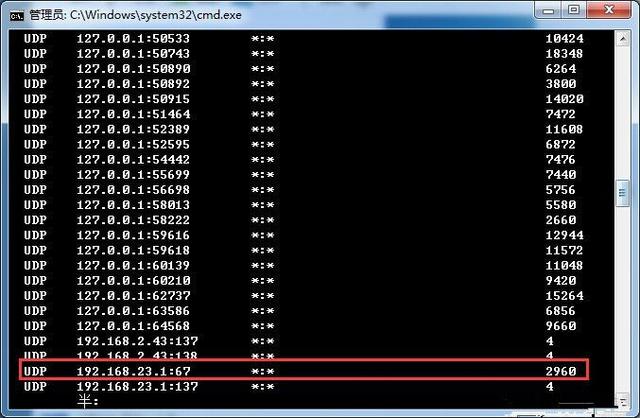 2、然后运行netstat -a -p udp -o(回车)这个命令符查看占用端口的程序,并找到占用192.168.23.1(24.1~33.1)的67端口的程序,记住它的PID。