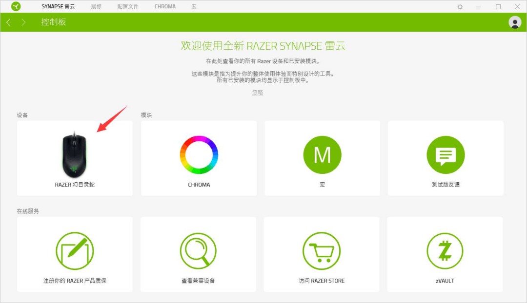 1、进入软件之后识别自己的雷蛇鼠标外设进行连接适配。