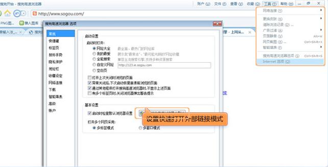 菜单选项中设置快速打开外部链接方法:点击菜单栏工具选项,然后点击搜狗高速浏览器选项;在常规的基本设置中,点击“设置搜狗高速浏览器为默认”按钮即可,如下图所示。